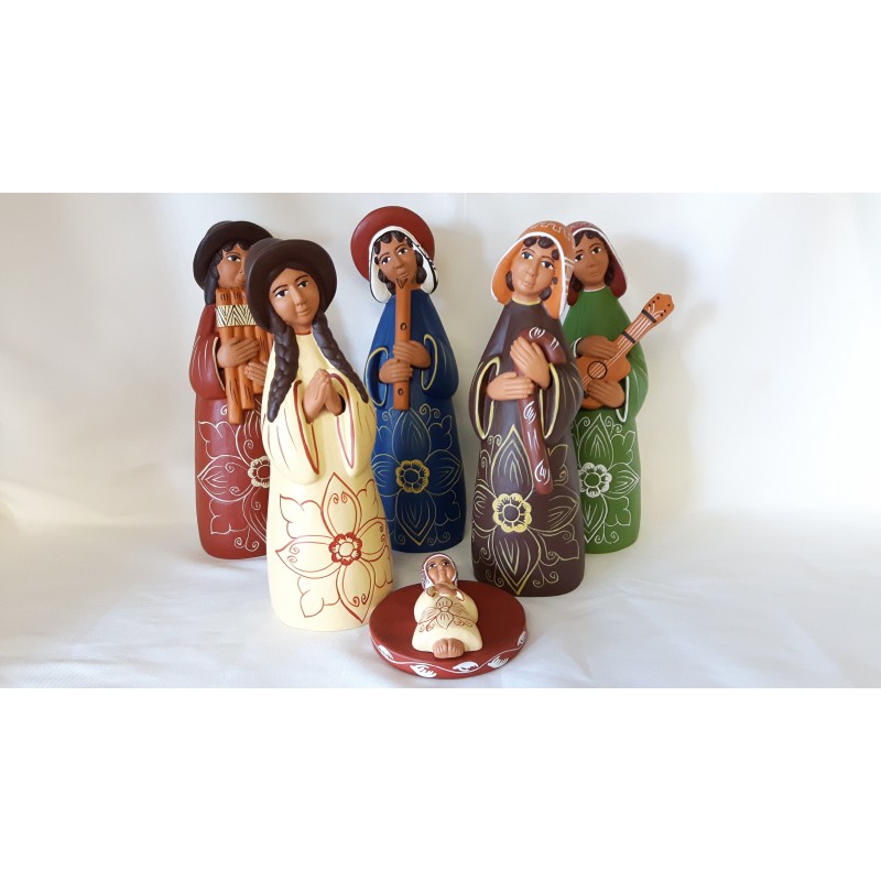 Crèche de Noël en terre cuite de grande taille composée de 6 personnages et un lit, contenant le petit Jésus, Joseph, Marie et 3 Rois Mages musiciens.
