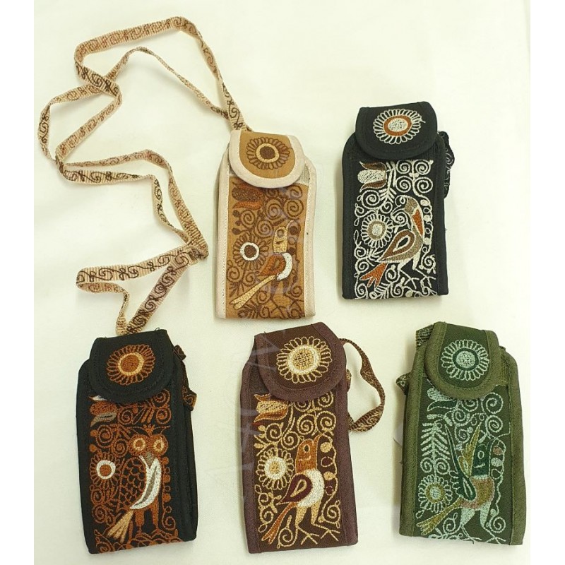 Mini pochette en tissu richement décorée de broderies multicolores avec une fermeture Scratch. Légère, cette pochette peut se fixer à la ceinture ou se porter en bandoulière.